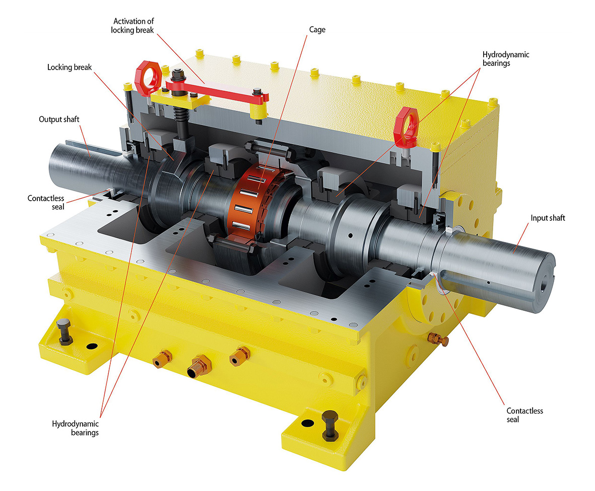 Housing freewheels are primarily used as automatically operating overrunning clutches in multi-motor drives. They are considered an alternative to complex switching devices. A technical highlight of the housing freewheels from RINGSPANN is the hydrodynamic clamping roller lift-off. In this case, the lifting force of the clamping rollers is generated by an oil film, which is applied to the raceway of the outer ring with centrifugal force during idle operation. This enables virtually wear-free idle operation.